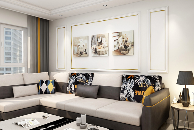 客廳大面積的白色墻底,金色線條營(yíng)造高級(jí)而內(nèi)斂的空間基調(diào),主沙發(fā)的白灰色系是屋主非常喜歡的顏色,更好的凸顯沙發(fā)的色質(zhì)。