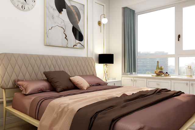 主臥墻面沿用客廳金色線條,同樣加上石膏線條與掛畫,讓空間富有節(jié)奏感的同時(shí)不失復(fù)古高級(jí)感,巧妙地營(yíng)造出了輕奢與舒適共存感。