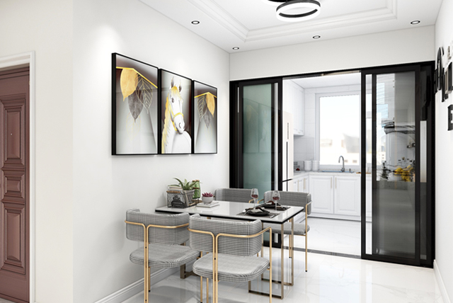 餐廳空間視野開闊,與客廳動(dòng)線緊密聯(lián)系,為了使兩個(gè)空間色彩不要過(guò)于單調(diào),餐廳墻面放置著組合裝飾畫,增添了空間趣味感。細(xì)節(jié)處的小設(shè)計(jì),讓簡(jiǎn)單的生活充滿儀式感。