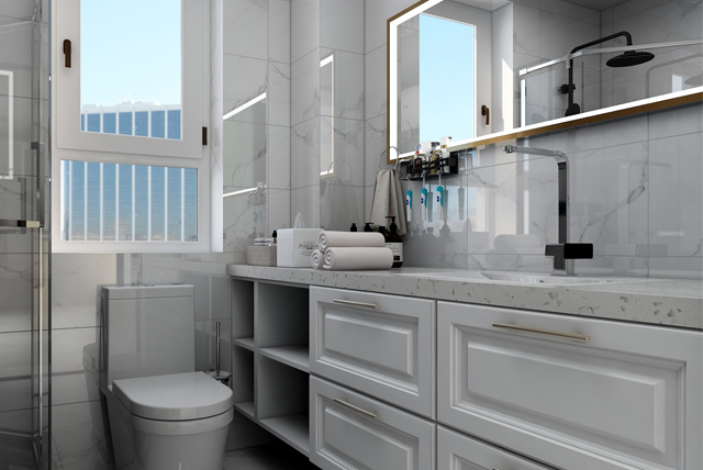 主臥衛(wèi)生間區(qū)域?yàn)槲葜鞔蛟斐鲎盍鲿车脑缙鹣词?dòng)線,水磨石瓷磚搭配乳白柜體,簡(jiǎn)潔明凈。